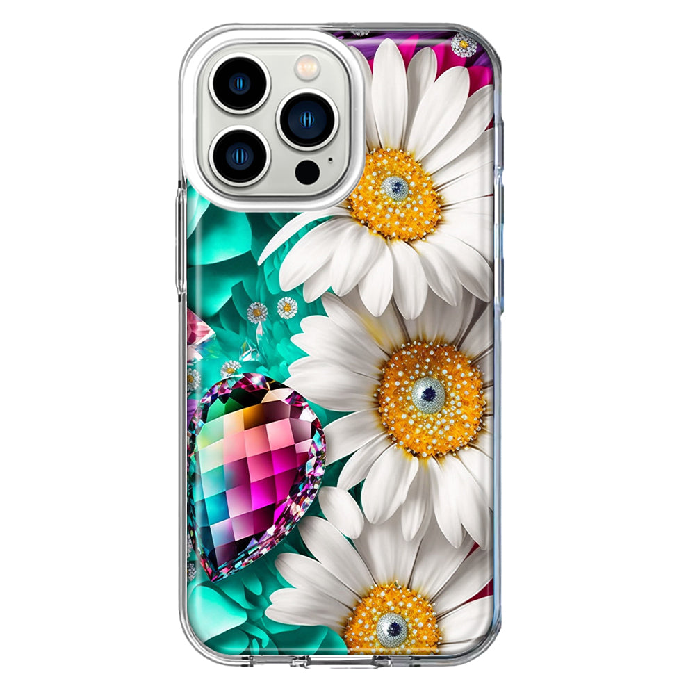For Apple iPhone 13 Pro Colorful Crystal White Daisies Rainbow Gems Teal Double Layer Phone Case Cover