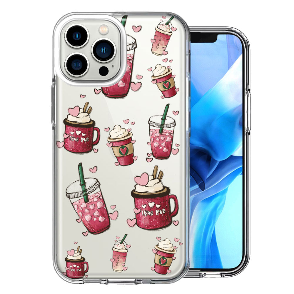 For Apple iPhone 14 Pro Max Coffee Lover Valentine's Hearts Pink Drink Latte Design Double Layer Phone Case Cover