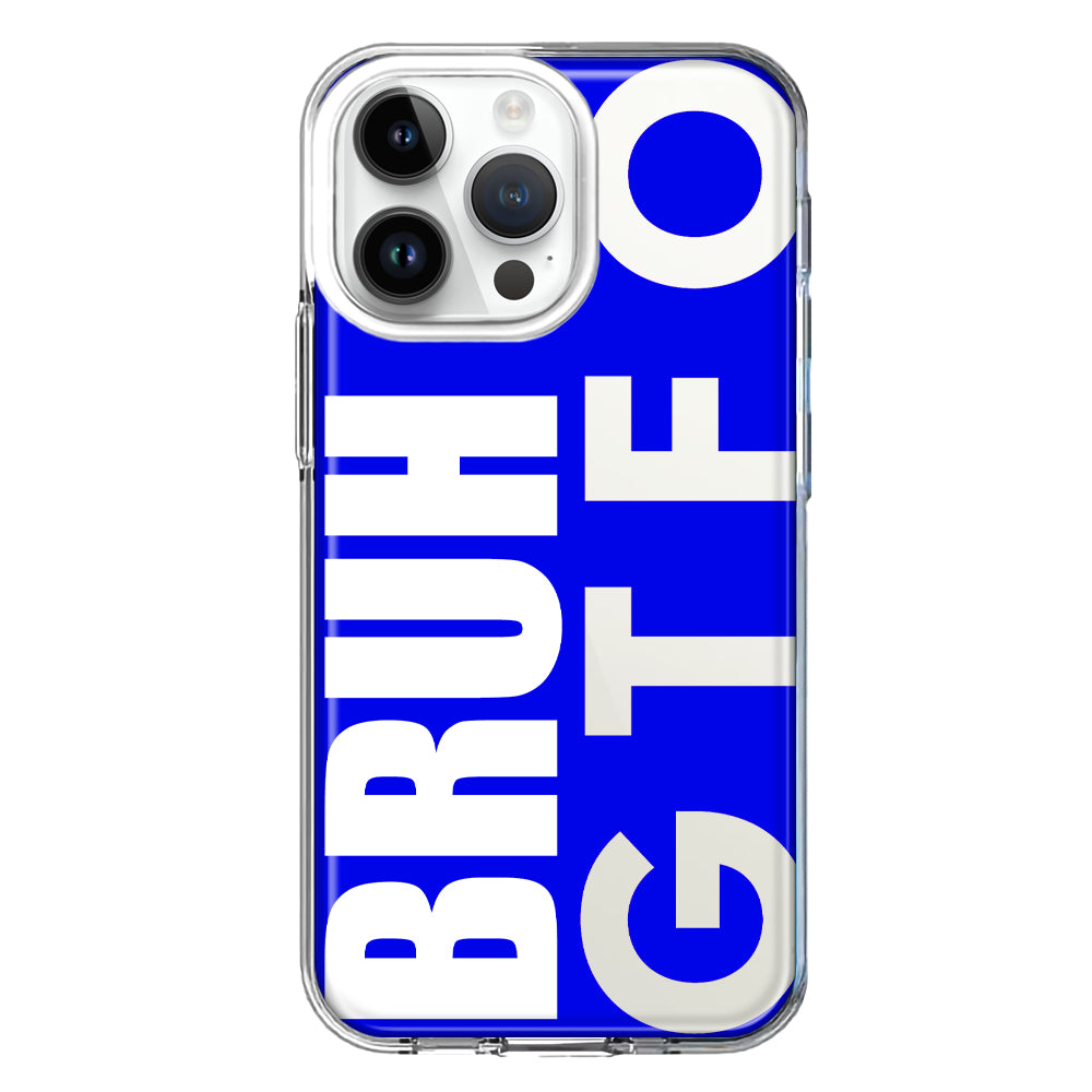 For Apple iPhone 15 Pro Blue Clear Funny Text Quote Bruh GTFO Design Hybrid Protective Phone Case Cover