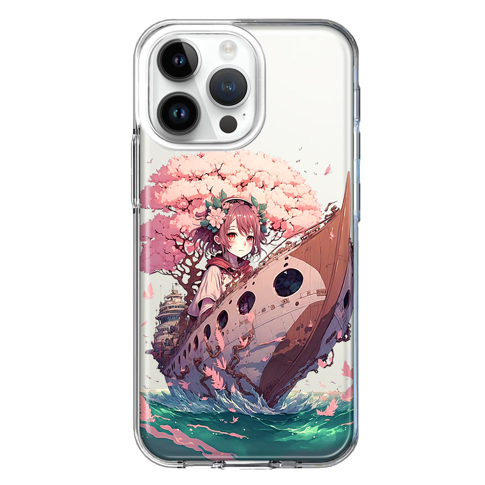 For Apple iPhone 15 Pro Kawaii Manga Pink Cherry Blossom Japanese Girl Boat Design Hybrid Protective Phone Case Cover