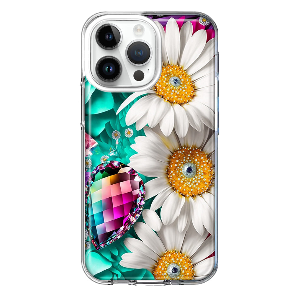 For Apple iPhone 15 Pro Max Colorful Crystal White Daisies Rainbow Gems Teal Double Layer Phone Case Cover