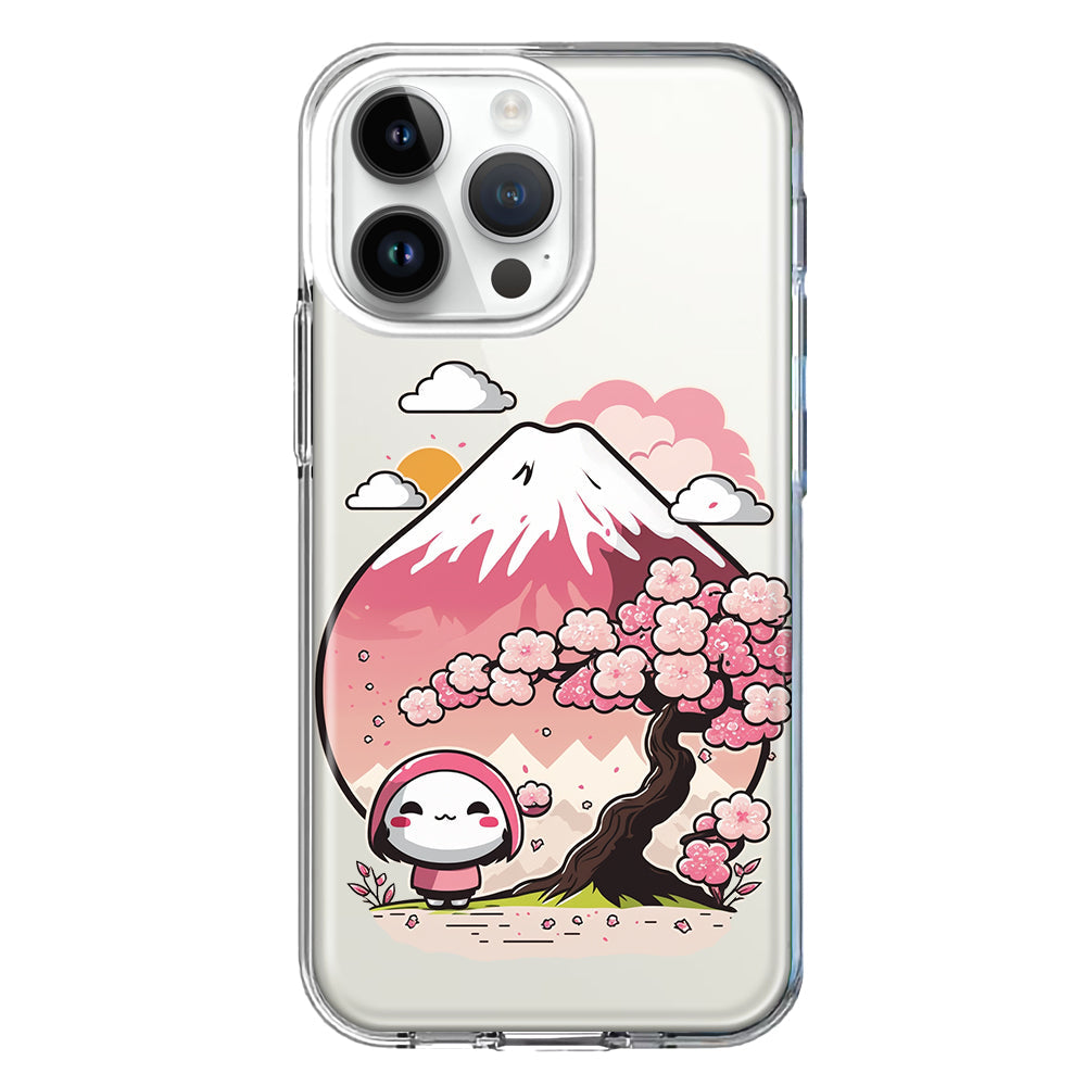 For Apple iPhone 15 Pro Max Kawaii Manga Pink Cherry Blossom Fuji Mountain Mochi Girl Hybrid Protective Phone Case Cover