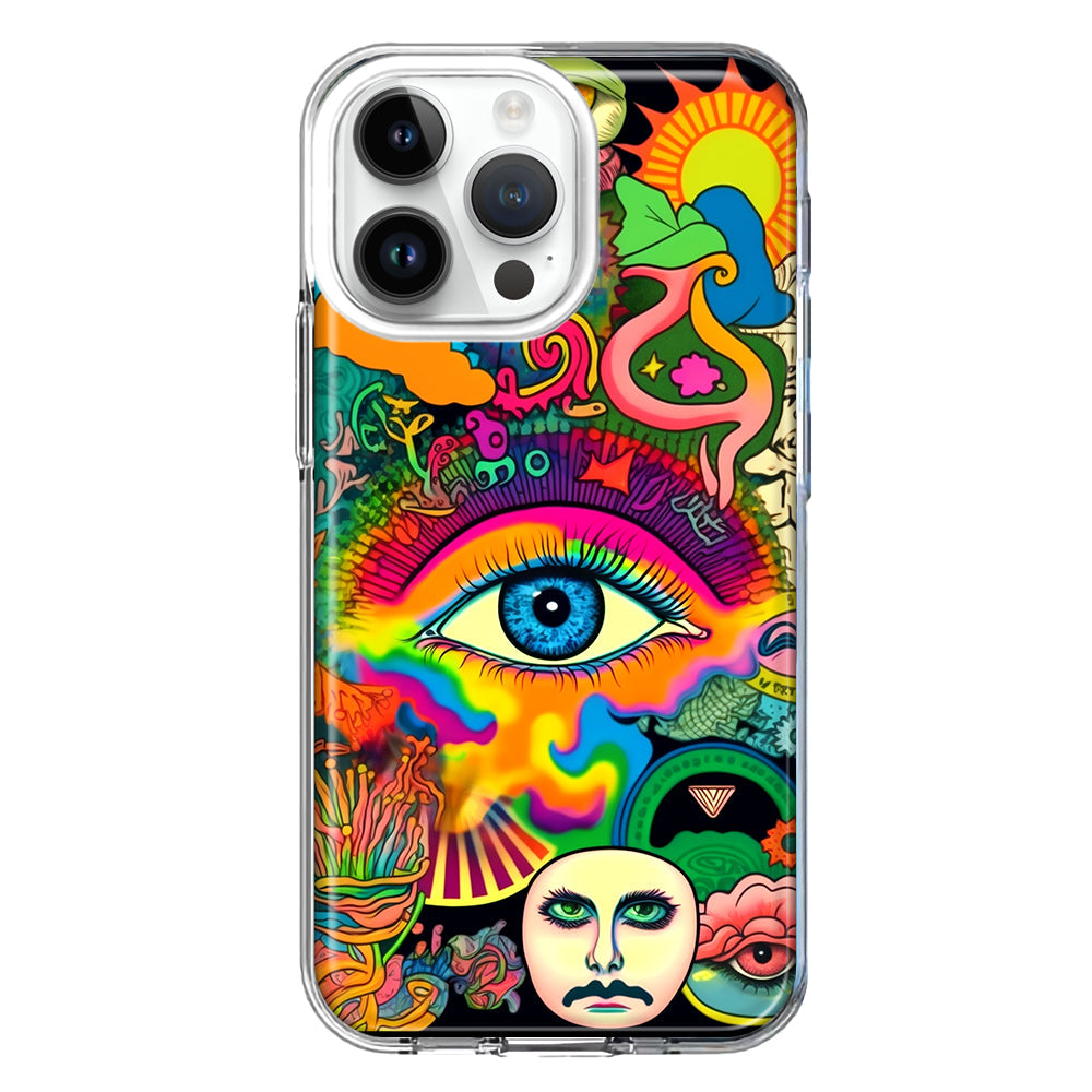 For Apple iPhone 15 Pro Neon Rainbow Psychedelic Trippy Hippie Multiple Eyes Design Hybrid Protective Phone Case Cover