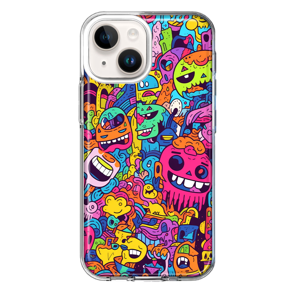 For Apple iPhone 15 Psychedelic Trippy Happy Characters Pop Art Design Hybrid Protective Phone Case Cover