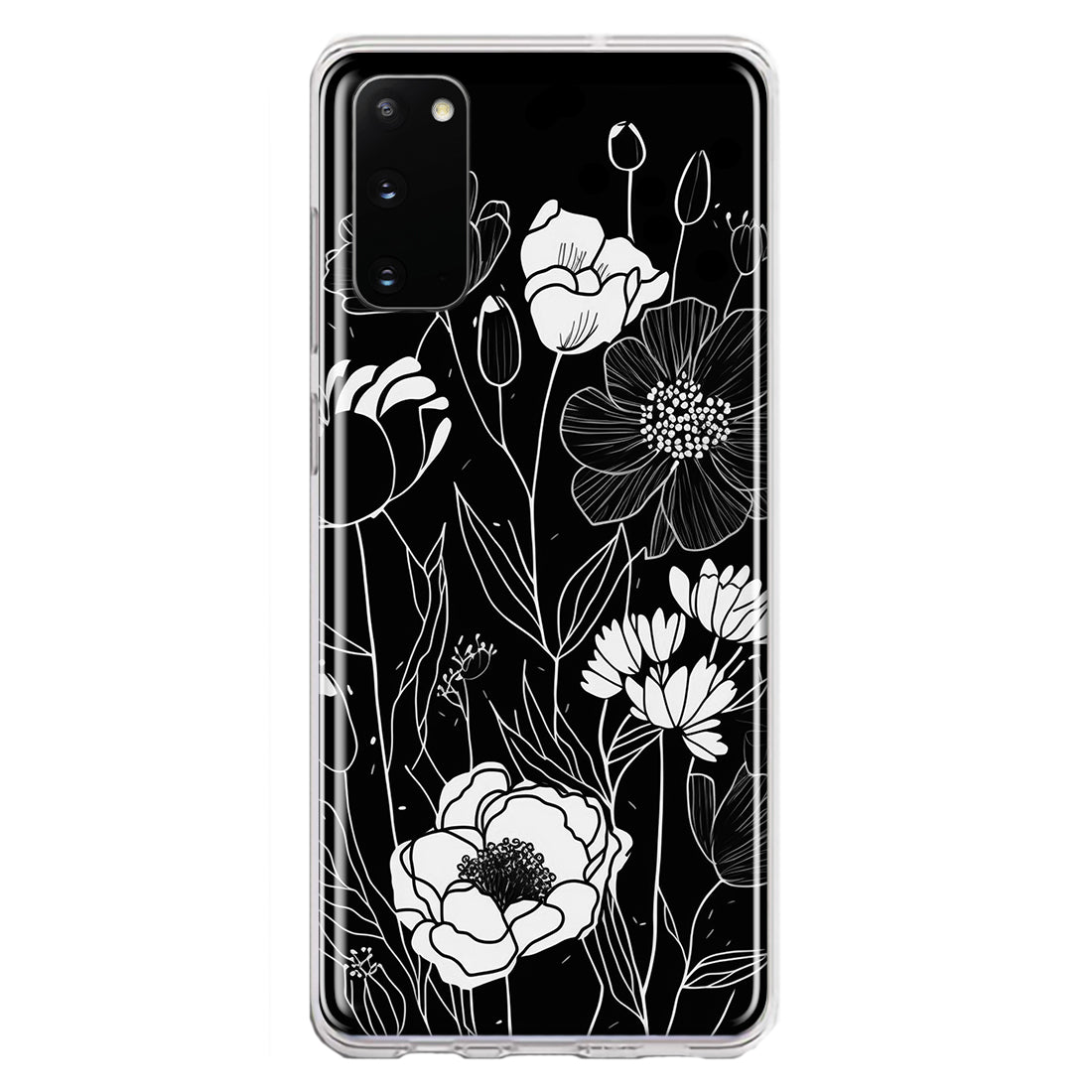 For Samsung Galaxy S20 Line Drawing Art White Floral Flowers Hybrid Protective Phone Case Cover