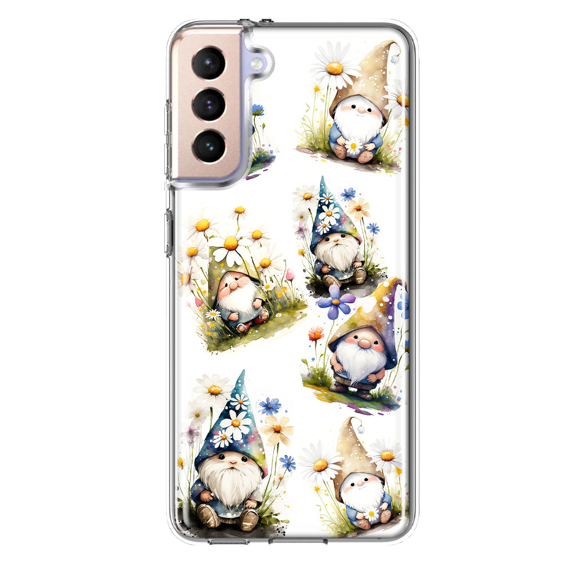 For Samsung Galaxy S21 Cute White Blue Daisies Gnomes Design Hybrid Protective Phone Case Cover