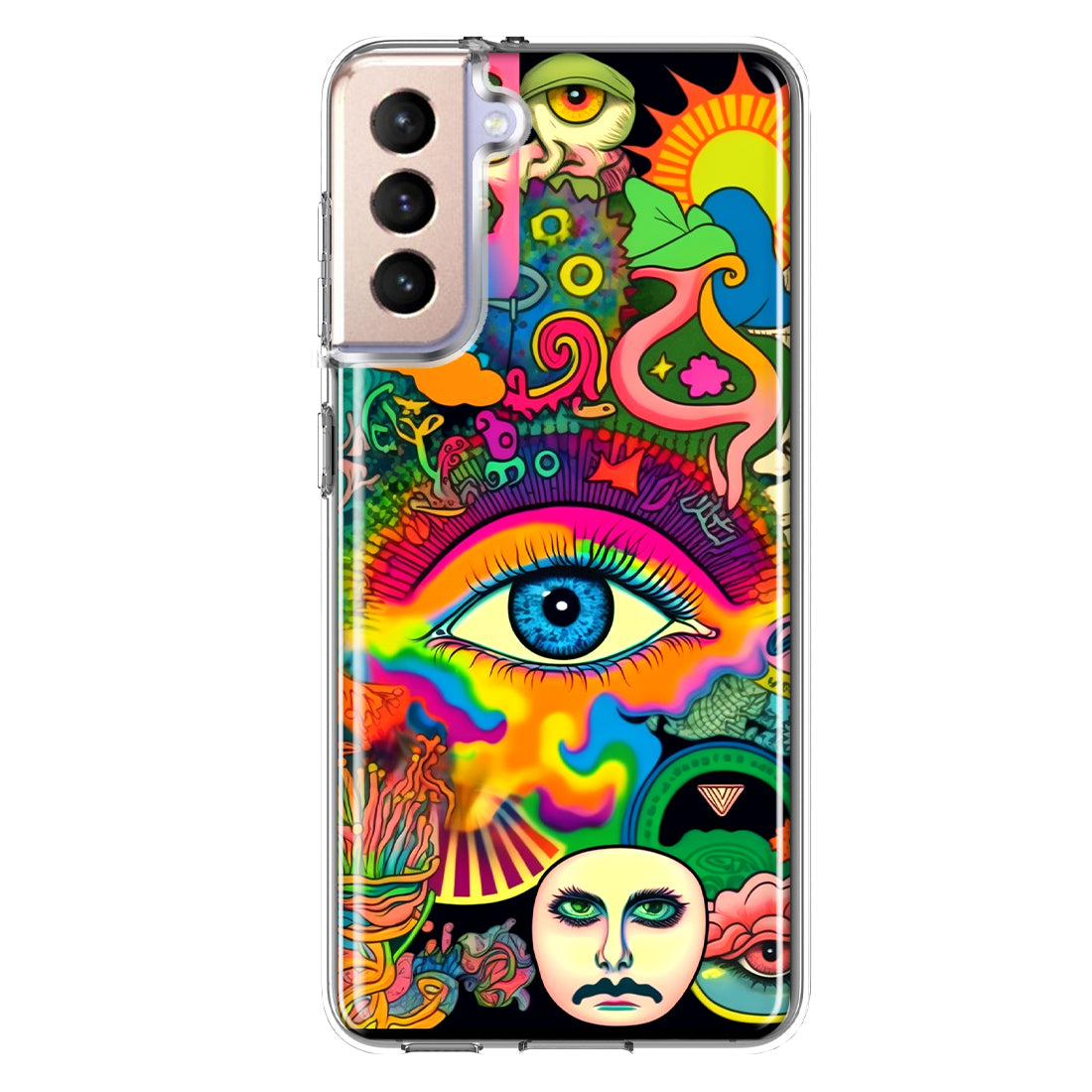 For Samsung Galaxy S21 Neon Rainbow Psychedelic Trippy Hippie Multiple Eyes Design Hybrid Protective Phone Case Cover