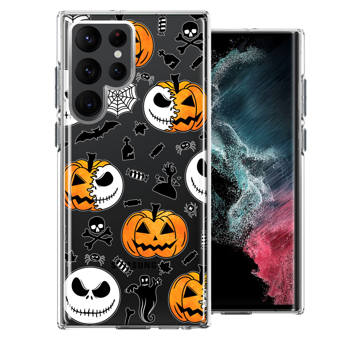 For Samsung Galaxy S22 Ultra Halloween Jack-O-Lantern Pumpkin Skull Spooky Design Double Layer Phone Case Cover