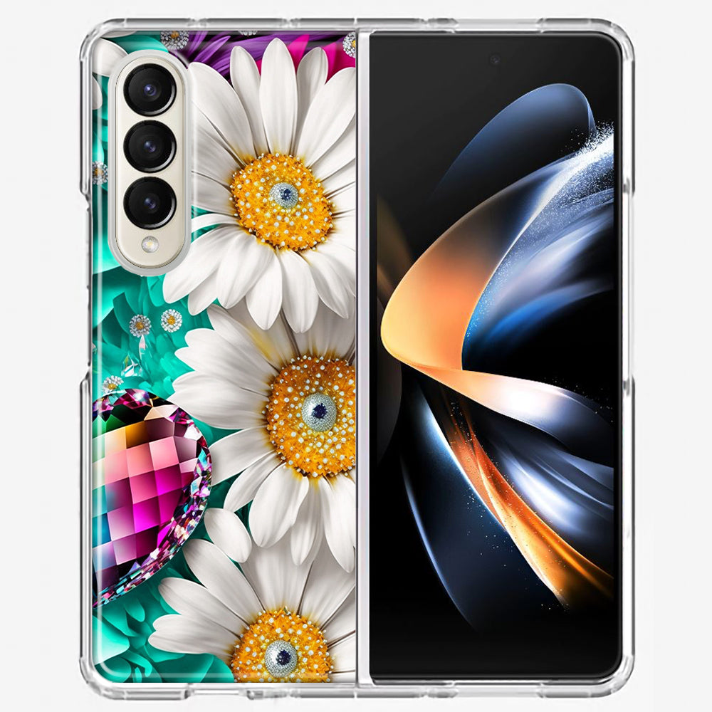 For Samsung Galaxy Z Fold 4 Colorful Crystal White Daisies Rainbow Gems Teal Double Layer Phone Case Cover